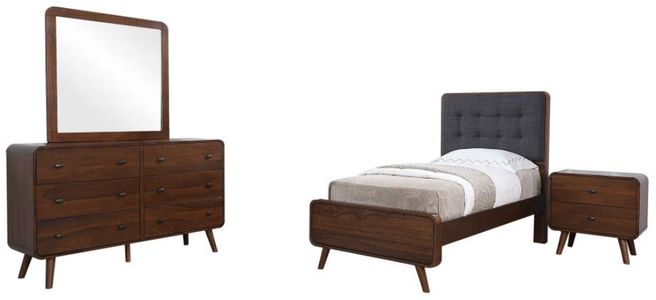 Transform your bedroom into the ultimate retreat with this mid-century modern bedroom set. Expertly crafted from pine, engineered wood, and walnut veneer, the set includes a bed, nightstand, dresser, mirror, and optional chest for a cohesive look. Rounded edges, tapered legs, and square tufting lend a retro-inspired flair.Read More