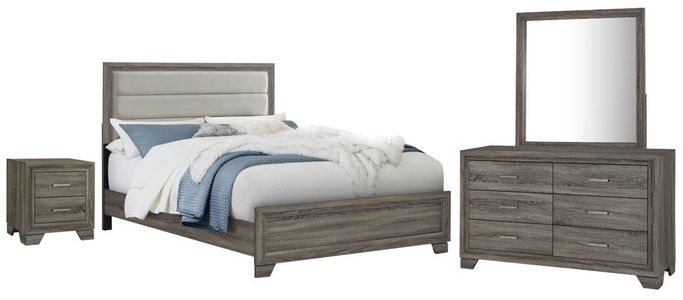 Crisp style enhances the clean lines of a wooden four-piece eastern king bedroom set with an upholstered headboard