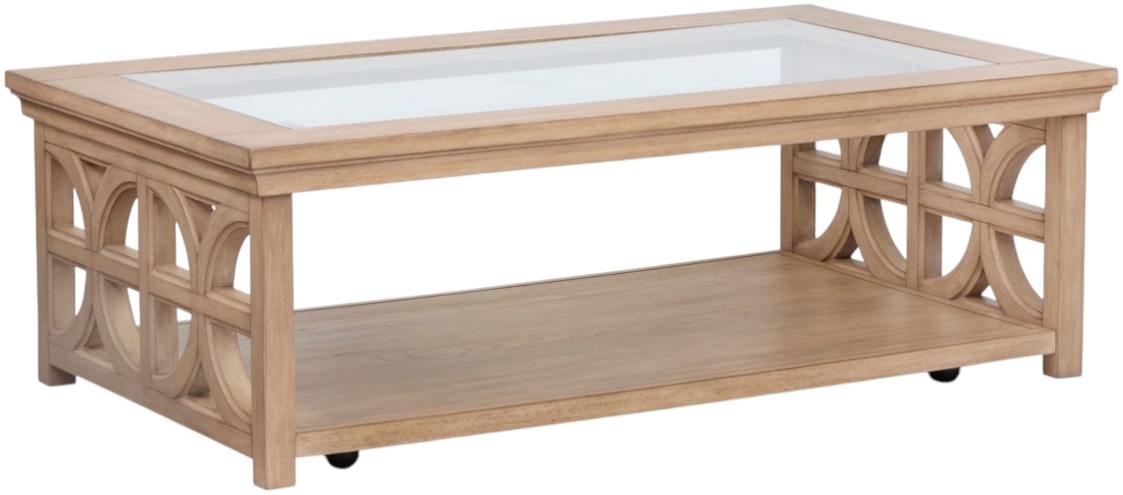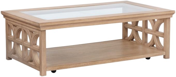 The Coventry rectangular shelf cocktail table offers a functional style with its beige finish and glass center top. Measuring 52"W x 30"D x 17"H, it features a shelf for added storage or display. Caster for mobility, its clean design and airy look make it a versatile accent for contemporary or casual interiors.Read More