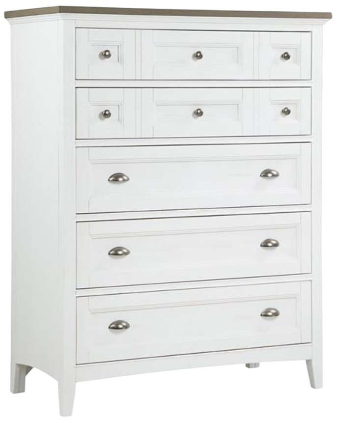 A soft Chalk White finish on Pine veneers and solids creates a relaxed beachy feel in any bedroom with Heron Cove. Select pieces offer a two-tone look with Dovetail Grey tops. A high back beaded framed panel bed lends shaker appeal and is available with hidden rails storage.Read More