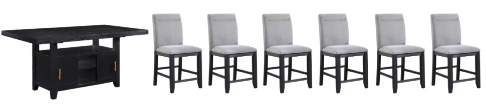 This 7-piece counter-height set includes a charcoal-finished table paired with six gray upholstered chairs. Designed for durability and comfort, it provides ample seating and a practical gathering space, making it well-suited for family meals or entertaining.Read More